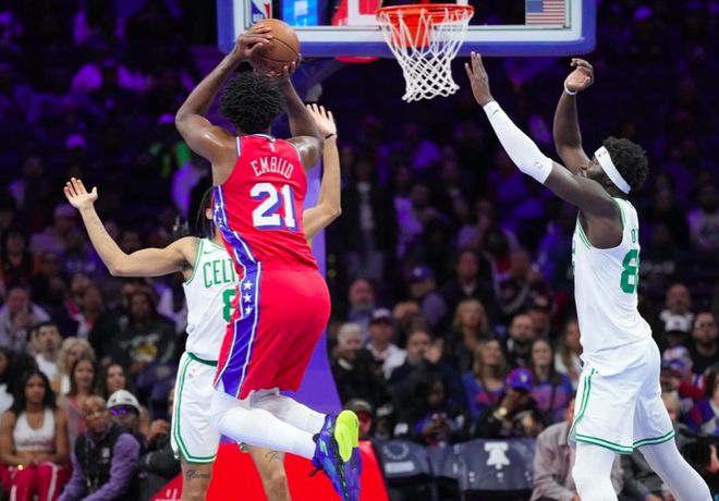 恩比德被罚5万美元!打成2+1后做不雅手势 大帝回应裁判也该罚